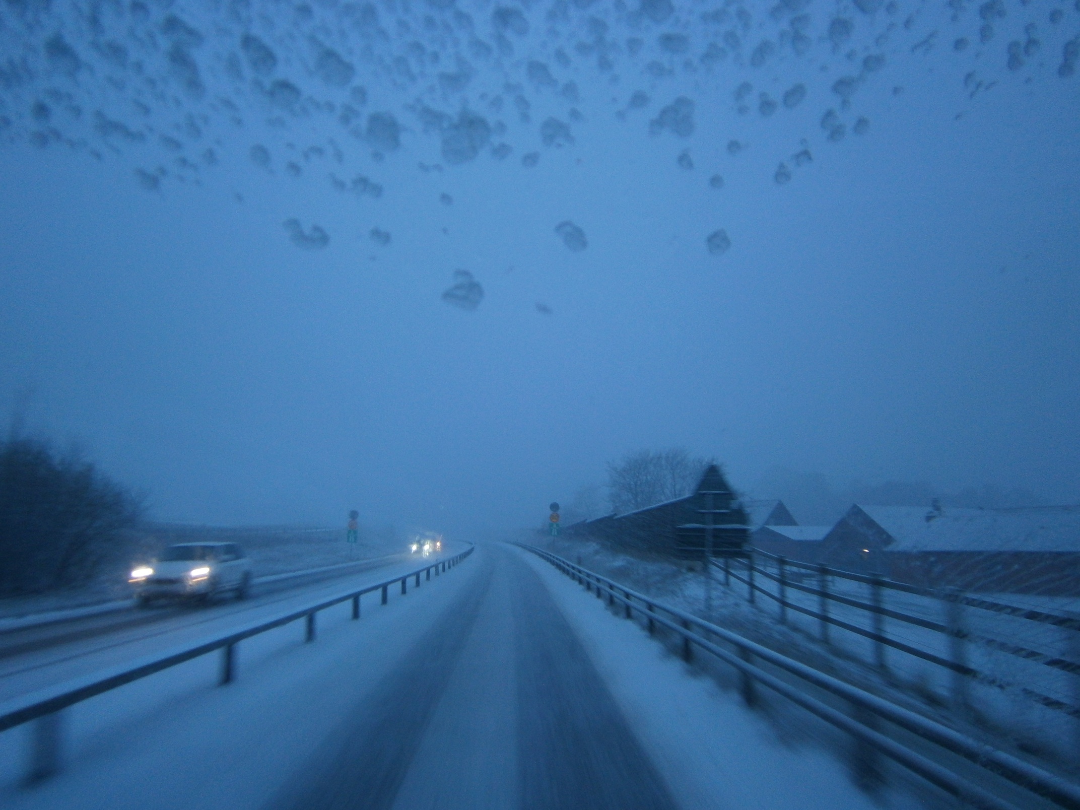 3/4 Upp 7. Väcks nästan av meddelande från grannen som visar Mörlunda i vitt. SMHIs prognos stämde. Vi har vinter. Frukost på bakat bröd. Sitter å väntar ut snöovädret. Olycka på Ölandsbron gör att vi inte kan komma av ön. Avstängd till ca 10. Enligt telefonen så öppnade bron ungefär då. Vid 11 chansar vi på att vi kommer härifrån och över bron. Vi kom från ställplatsen lätt. Han kan min man. Kommer över bron också. Stannar i Högsby och handlar(!) lite på Coop 20 i 1. Vägen genom skogen är vintrig Vid 1 kör vi in på tomten som grannen har halvskottat åt oss. Tack för det. Totalt: 132,9 km Summa till promenadkontot: 14,37 km Lufsen har varit lite törstig. K misstänker att vinterhjulen inte riktigt passar för jobbet.